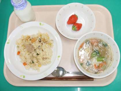 *五目チャーハン *ワンタンスープ *くだもの(いちご) *牛乳