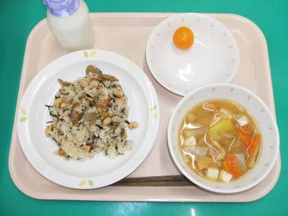 *豆入りひじきごはん *とんじる *きんかん *牛乳