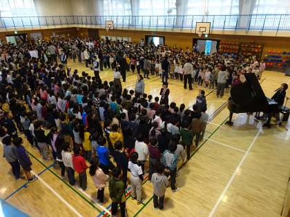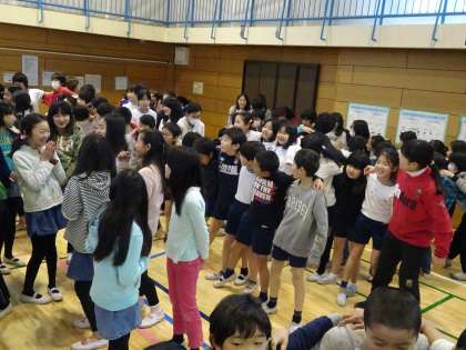 音楽朝会 公開日 2019/02/28 更新日 2019/02/28 その他の教育活動 「ともだちはいいもんだ」を歌いました。 今回は、いつも子供の頑張りを見ているので、はじめに先生達が歌いました。 その後、先生達がクラスの列の前に立ち、みんなで一緒に歌いました。最後はみんなで肩を組ん歌いました。 今のクラスで過ごすのも、残りわずかです。友達の大切さを感じながら過ごしましょう。(2月28日)