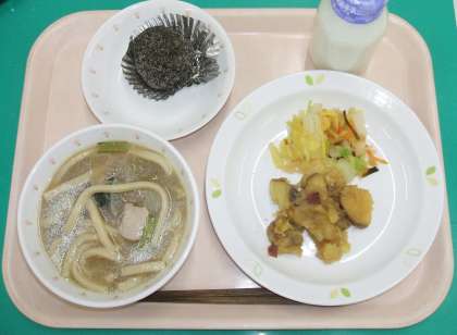 *けんちんうどん *さつまいもの煮ころがし *白菜のゆず風味 *ごまぼたもち *牛乳