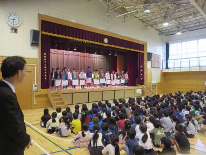各委員会の委員長さんが、委員会の目標や方針を全校児童に伝えました。