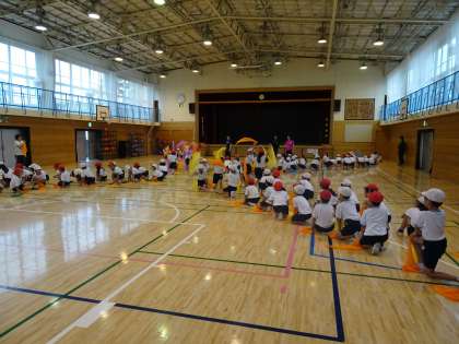 運動会に向けてダンスの練習をしています。初めてスカーフを持って踊りました。右手にクラスカラ—(1組ピンク、2組青、3組黄色、4組緑)のスカーフ、左手にオレンジ色のスカーフを持っています。スカーフを持って笑顔で踊っている様子が印象的でした。練習を重ねるごとに上達しています。いよいよ、今週の土曜日は本番です。