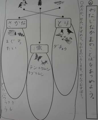国語「なかまのことば」(2年生) 公開日 2019/05/30 更新日 2019/05/30 2年生 国語で「なかまのことば」の学習をしました。すずめやダチョウは鳥の仲間、テントウムシやせみは昆虫の仲間、メダカやまぐろは魚の仲間。また、鳥、昆虫、魚は動物の仲間というように言葉を仲間分けしました。すすんで手を挙げて発表したり、隣の子と意見を交流したりして、意欲的に学習する様子が見られました。