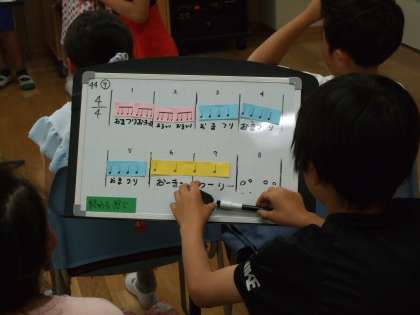 音楽では音楽づくりをしています。「おまつり」や給食のこんだてなど4文字の言葉を使って、リズムを組み合わせて音楽を作っています。子供達の発想は豊かで音楽に親しみ楽しんでいます。