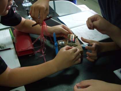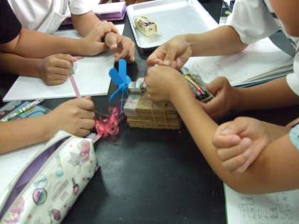 かん電池とモーターをつなぎ、プロペラを回して、いろいろな実験を行います。
