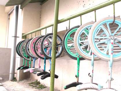 校庭にはすべり台やブランコがあり、一輪車や竹馬も用意されています。この広い校庭で子どもたちは友だちと楽しく遊んでいます。(4月5日)