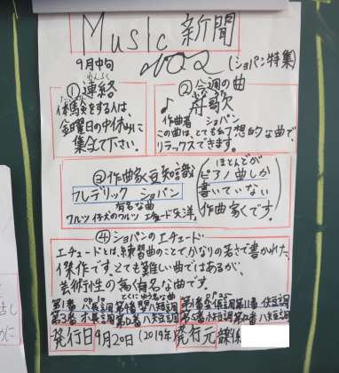 音楽係は、新聞を教室に掲示したりキーボードを用いた演奏会を開いたりしています。
