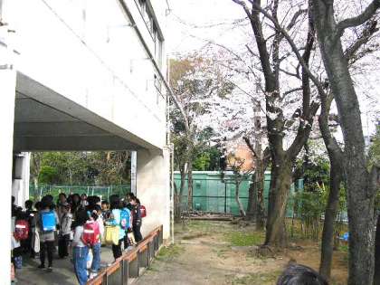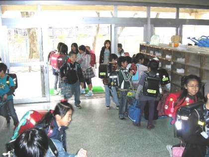 今日から授業が始まります。子どもたちは、朝のチャイムがなるのを昇降口で待っています。(4月7日)