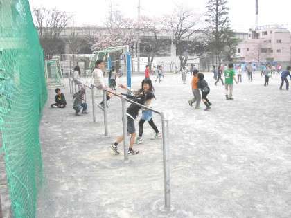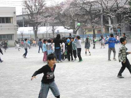 広い校庭で仲良く友だちと遊んでいます。(4月7日)