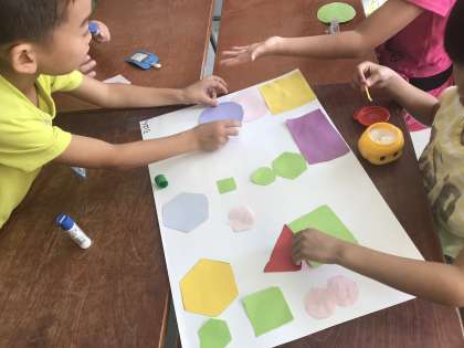 子どもたちは、身の回りの物を使ったかたちの学習にとても楽しそうでした。