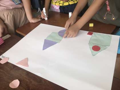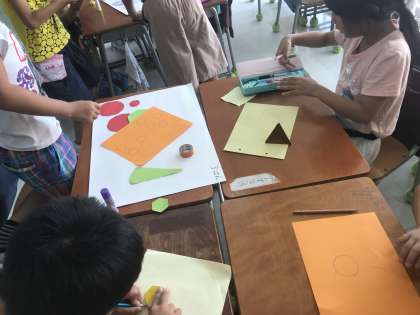 学習してきたかたちの模型を画用紙に写し取り、切った物をはり合わせて、班ごとに作品を作りました。