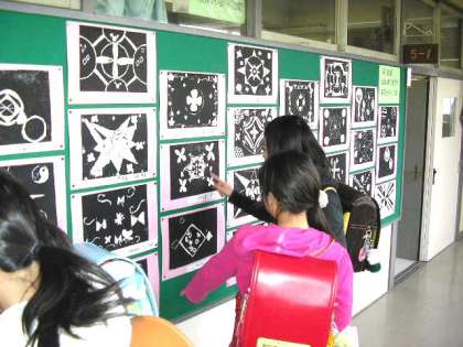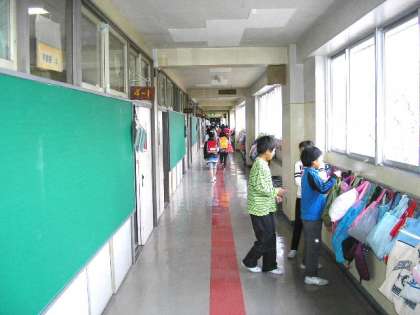 登校してきた子どもたちは、荷物の整理をしたり掲示された自分たちの作品をながめたりして過ごしています。(4月8日)
