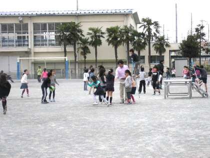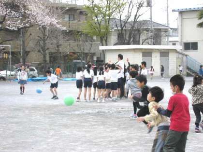 先生といっしょに鬼ごっこをして楽しんでいます。(4月8日)