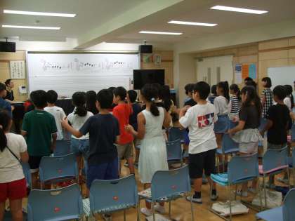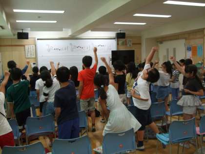 明日10月3日(木)の音楽朝会に向けて、音楽の授業の前半に「Movin' on!」を歌っています。手を叩きながら左右に揺れたり、友達と腕をタッチさせたりと、子供たちはとても楽しそうに歌い踊っています。(10月2日)