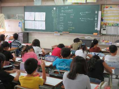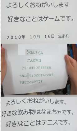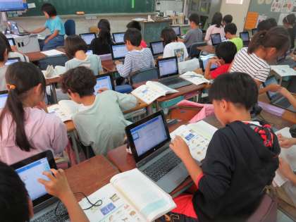 子供たちは、タブレットやパソコンでのローマ字入力の経験がほぼない中、教科書のローマ字表を片手にキーボードとにらめっこしながら懸命に名刺を作る様子がありました。