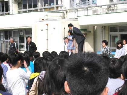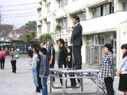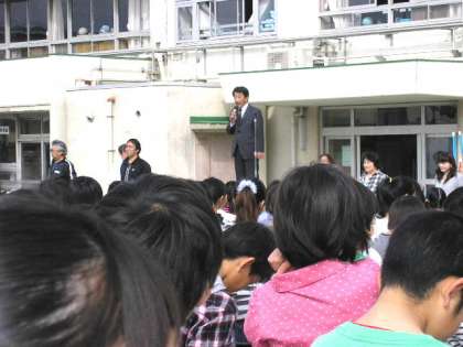 最初に6年生の言葉で朝礼が始まりました。今日も、新しい友だちが転入してきました。(4月11日)