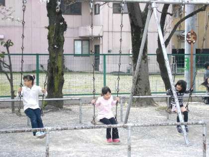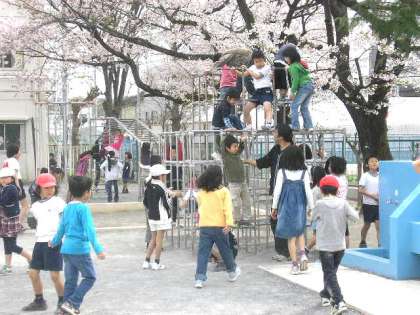 喜多見小学校には、ジャングルジムとブランコがあります。休み時間は、みんな楽しく遊んでいます。(4月11日)