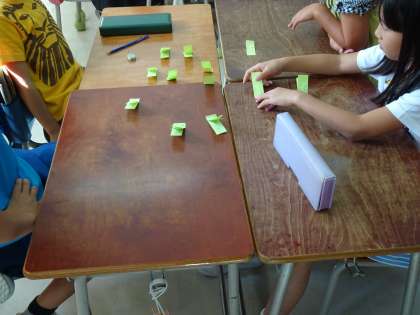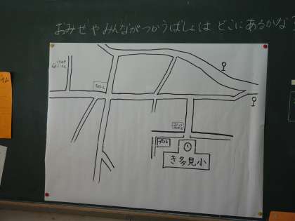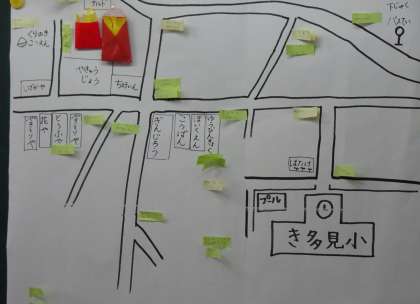 生活科「町たんけん」の学習では、喜多見小の近くにはどのようなところがあるのか思い出し、ふせんに書きました。新聞屋、薬屋、魚屋、保育園、郵便局とたくさん出ました。また、「肉屋の隣が豆腐屋で、その隣が花屋です。」「ここでは、夏になるとかき氷を売っています。」と位置関係やお店の詳しいことまで伝えていて感心しました。