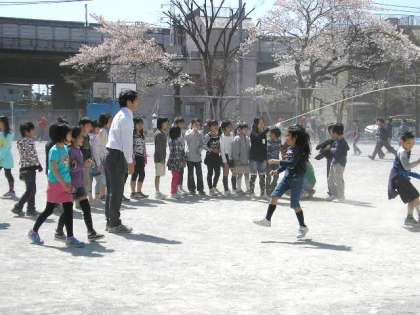 今日も天気がよかったので、たくさんの子どもたちが校庭で遊んでいました。(4月13日)
