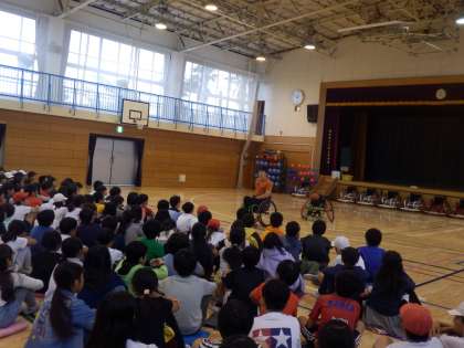 10月18日(金)に4年生が車いすバスケットボールの体験をしました。シドニーパラリンピック、車いすバスケットボール日本代表(キャプテン)の根木慎志先生をお招きしてお話を聞いたり、実演をみたりしました。各クラスの代表児童による車いすバスケットボールの試合では、大きな声援で体育館中があつくなりました。「みんなの声が聞こえてがんばろうと思った。」「やり方を教わっていなくて不安だったけど、楽しかった。」と体験した児童はふり返っていました。