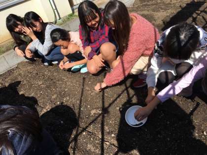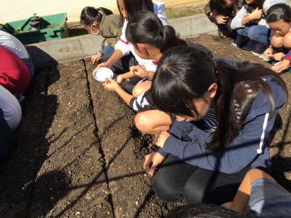 6年生の労作活動では、小松菜を育てます。今日はその種まきをしました。収穫した小松菜は9年教育を共に取り組んでいる喜多見中学校の給食となります。講師として中村先生(元校長先生)に来ていただき「1cmに1粒まくこと」「土はふわっとかぶせること」などのポイントを教えていただきました。大きくなあれ!