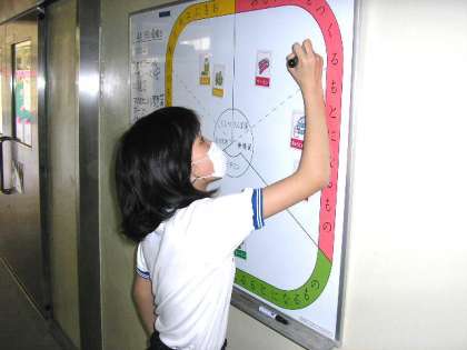 明日の献立をみながら栄養黒板に給食を紹介していました。(4月14日)