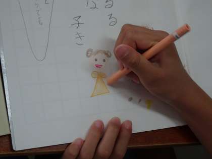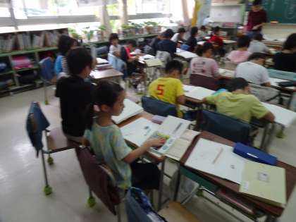 日本語(2年生) 公開日 2019/10/28 更新日 2019/10/28 2年生 日本語で俳句の学習をしました。 「団栗(どんぐり)も かきよせらるる 落葉かな」と「赤蜻蛉(あかとんぼ) 筑波に雲も なかりけり」の2つの俳句を朗誦し、五・七・五音のリズムを楽しみました。 また、2つの俳句から好きな方を選び、俳句の情景を想像して、絵で表現しました。 秋に関する俳句に親しみました。