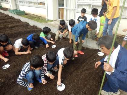 10月21日(月)に総合「野菜を育てよう」の学習で小松菜の種まきをしました。中村先生から小松菜の種の特徴や種まきの仕方についてお話を聞き、一人ずつ畑に種をまきました。とても小さな種からどのように成長していくのか楽しみです。