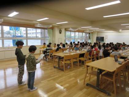 ランチルーム給食(3年生) 公開日 2019/11/01 更新日 2019/11/01 3年生 10月29日 今日は、3組と4組合同でランチルームで給食を食べました。 普段の給食とは異なり大勢で食べる給食は、楽しいひと時となりました。 3年