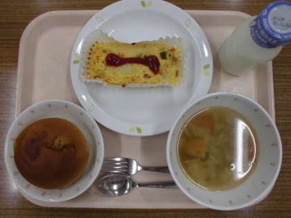 オムレツには、じゃがいも、たまねぎ、赤ピーマン、ピーマンなどたくさんの野菜が入っています。具だくさんで食べ応えがあり、栄養もまんてん!とっても満足できました!