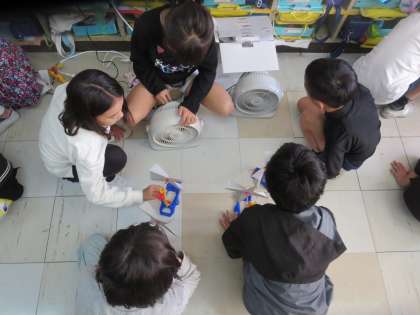 風の強さが変わると風車の回り方に変化が生じるのか予想を立て、実験をしました。