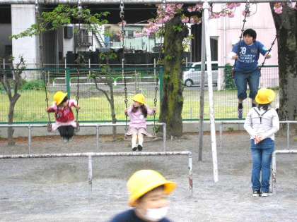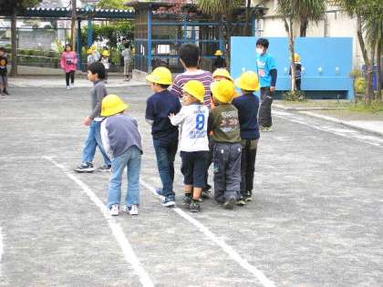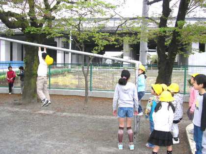 6年生のお兄さんやお姉さんたちと一緒に校庭で遊んでいます。(4月21日)
