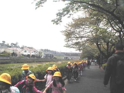 1年生は、となりの友だちと手をつなぎ歩いていきました。(4月22日)