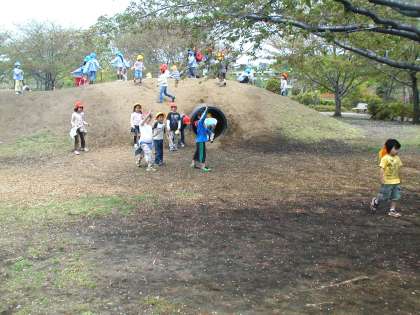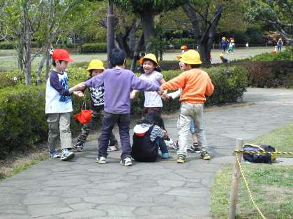 公園では、2年生が1年生をしっかりお世話していました。みんな班ごとに楽しく遊ぶことができました。(4月22日)