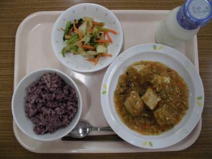 今日のごはんは、黒米を入れた黒米ごはんです。子供たちは、いつもと違うごはんの色に最初は戸惑っていましたが、いざ食べてみると「ぷちぷちする!」「おいしい!」ともぐもぐ食べていました!