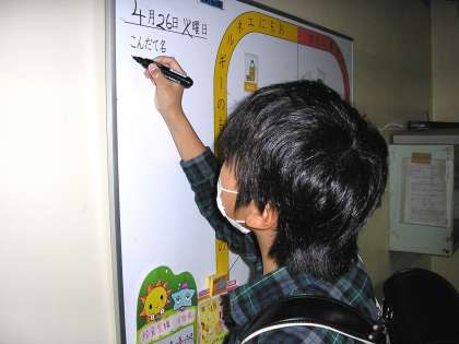 給食委員会は、明日の献立を給食室前の黒板に書いています。(4月25日)