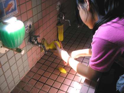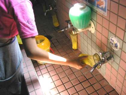 保健委員会は、1週間に1回流し場の石けんを補充しています。(4月26日)