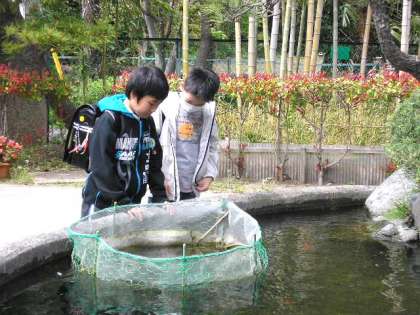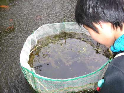 池の水はきれいに浄化されているため、金魚や小さなメダカもよく見えます。(4月27日)