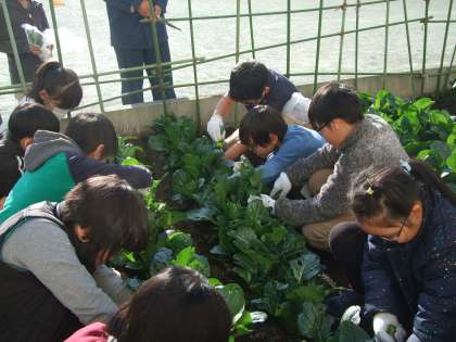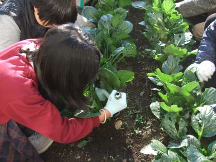 4年生は小松菜を育て、本日収穫をしました。無農薬の青々とした美味しそうな小松菜ができました。「小松菜ピザにしよう」「小松菜ケーキを作ろう」など、何を作ろうかと、子ども達はとても楽しみにしていました。作ったもののレシピを今後校内で紹介する予定です。(12月18日)