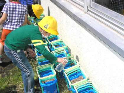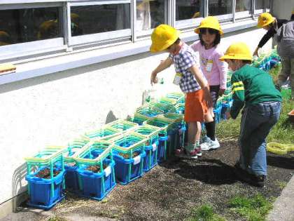 教室前で育てているアサガオに水をあげています。早く芽がでるのを楽しみにしています。(4月28日)