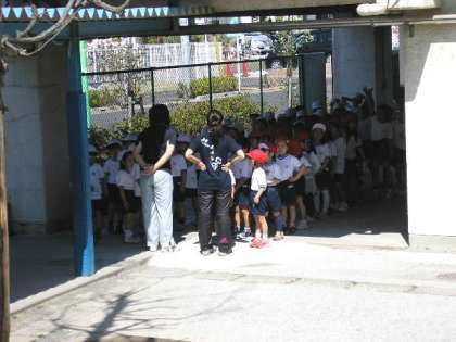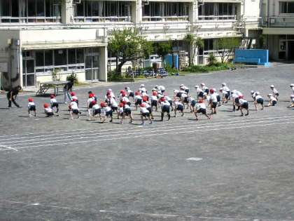 合同体育を行いました。先生の動きに合わせて体をほぐしました。(4月28日)