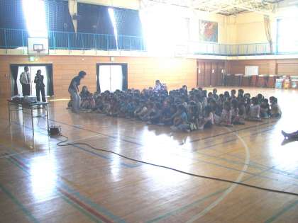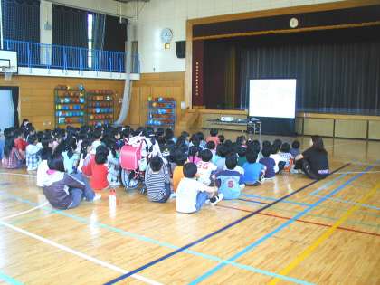 体育館で交通安全教室がありました。警察の方が、動画も交えてわかりやすく説明してくださいました。(4月28日)
