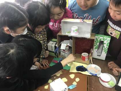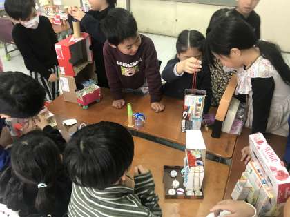 図工(1年生) 公開日 2020/01/29 更新日 2020/01/29 1年生 図工「ゆめのまち3ちょうめ」 「こんなおうちあったらいいな」という思いから、一人一つ家を作り、班のみんなであわせて「ゆめのまち」を作りました。 家作りでは、屋上にプールがあったり、家の中にエレベーターがあったりと夢がふくらみました。 町作りでは、木、道路、信号、噴水など班の友達と相談しながら「ゆめのまち」を楽しく作り、工夫する姿が見られました。