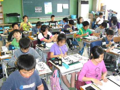 5年生になって初めての習字をやりました。交流という字を練習しましたが、みんな1字1字に気持ちをこめて書いていました。(5月9日)