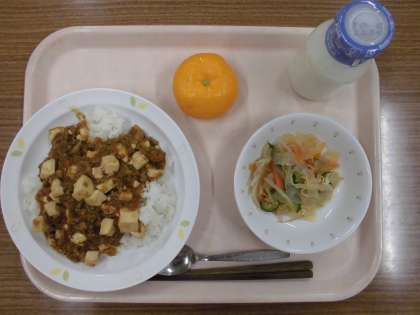 マーボー丼は、低学年と高学年で辛さを調節して作っています。1年生も安心してもりもり食べることができます。