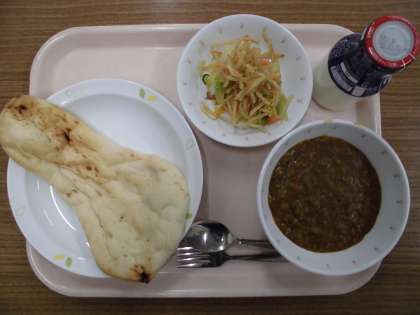 今日は、インドをイメージした給食です。大きなナンを手でちぎって、いただきます。飲むヨーグルトが口の中をさっぱりさせてくれますね。