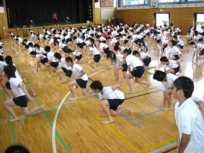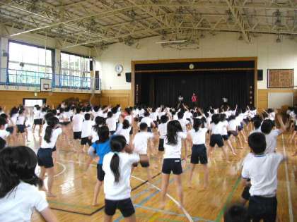 6年生の演技を真似しながら運動会の練習をしています。(5月11日)