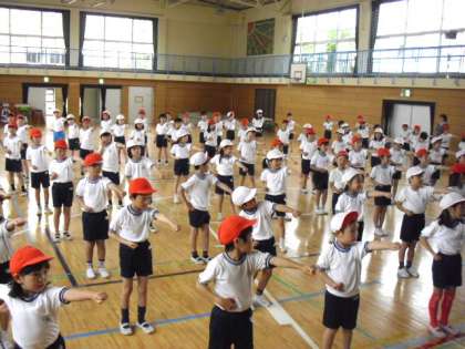 運動会の表現を体育館で練習しました。動きがそろってきました。(5月12日)