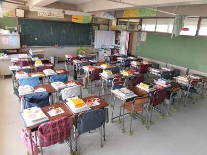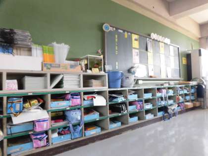 月曜日は分散登校ですね。自分の登校時刻をよく確認して、まちがえないようにしてください。都合の悪い時は他の時間にかえることもできます。みんなが来るのを、先生と写真に写っているたくさんの渡すものが待っています。