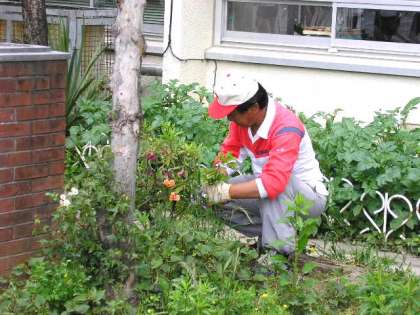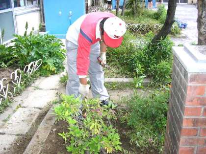 校長先生が花壇の雑草をとっていました。その後に、ジャガイモやインゲンマメ、さとうきびなどを植えて育てています。(5月16日)